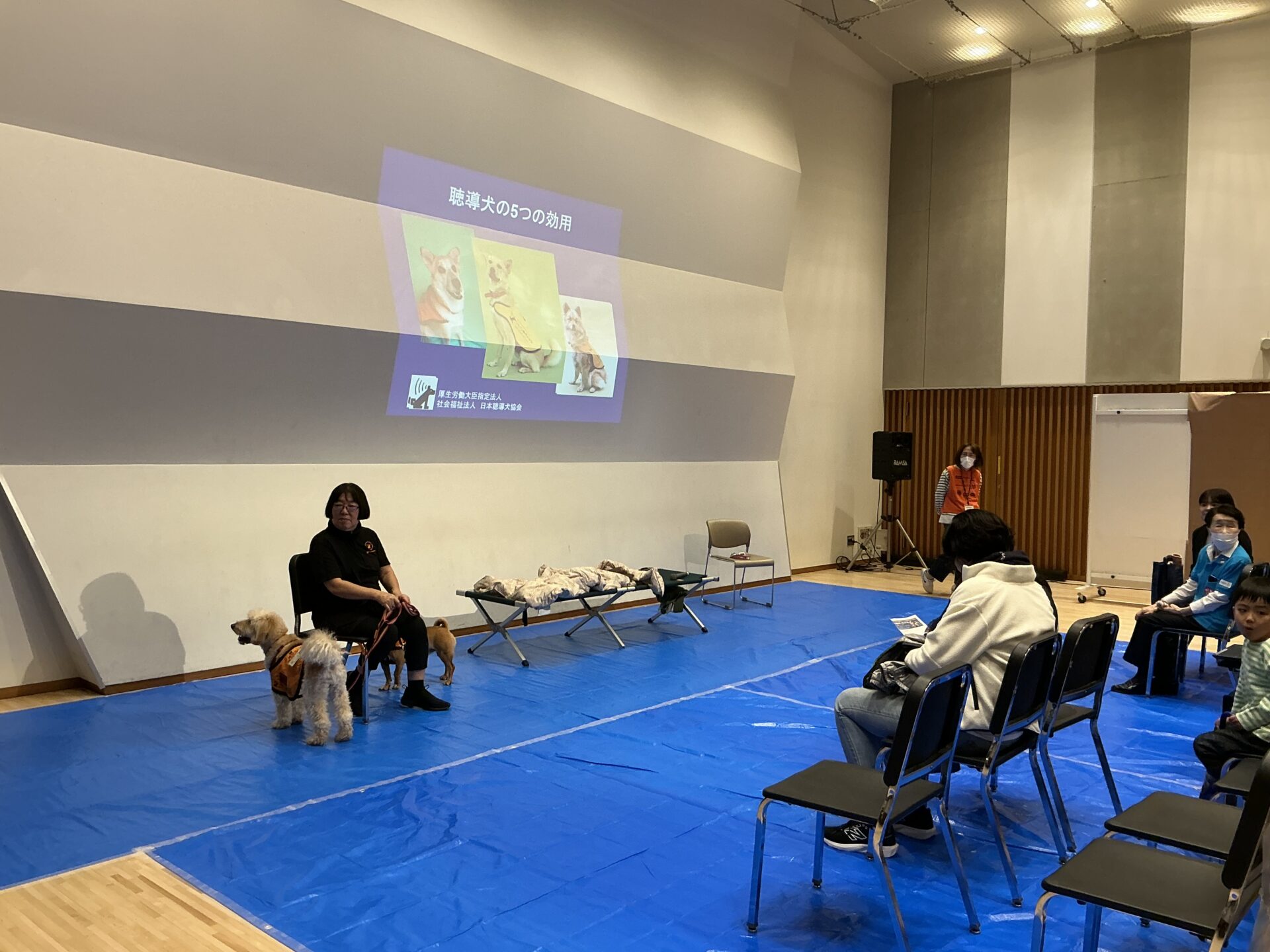 その体験活動のひとつとして、東京青山ロータリークラブが「人と動物の絆」の体験の機会を創られました。「伴侶動物は、人類の宝物・奇跡のパートナー」を子ども達に直接体験して貰う貴重な機会です。今回の会場は、国立オリンピック記念青少年総合センター カルチャー棟地下1階リハーサル室で、社会活動をする犬達によるデモンストレーションが、公的な施設の室内で実現できたことも、素晴らしい成果です。室内での開催は、子ども達にも、天候に左右されない安定した環境を提供できますし、このような体験活動の取り組みを行っている皆様には、とても心強い取り組みと映るのではないでしょうか。